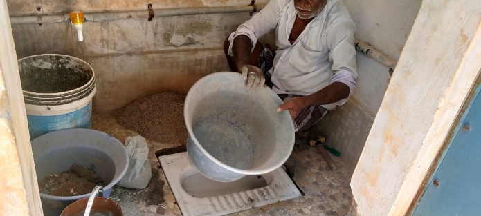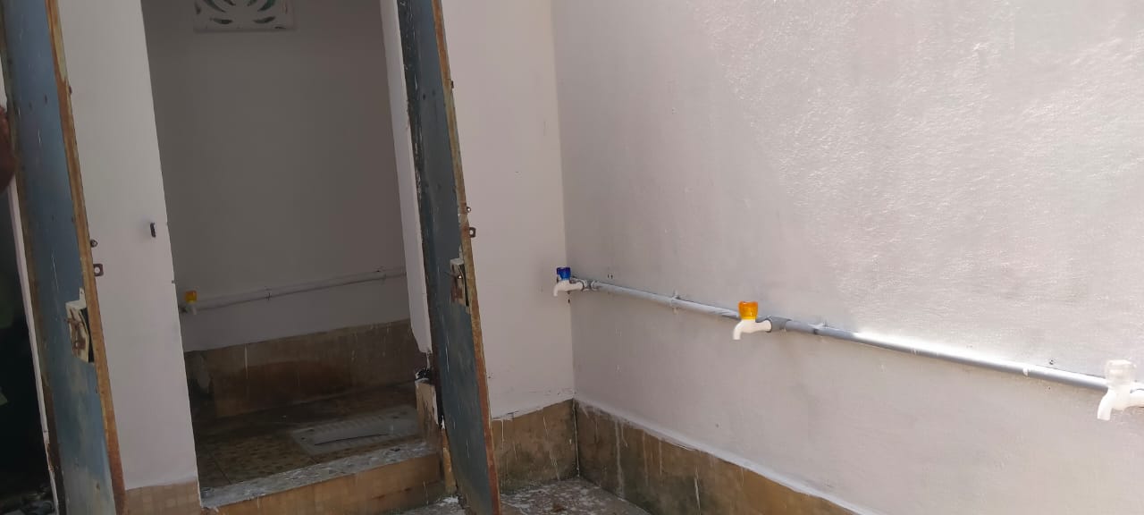 The project began with clearing the area of debris and fallen leaves. The existing dilapidated toilets were removed, and four new units were installed—two in the girls’ restroom and two in the boys’. Though there was an overhead water tank, the plumbing system was extensively damaged. We removed the old pipelines and replaced them with new ones, along with installing new taps in both restrooms.