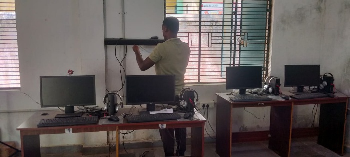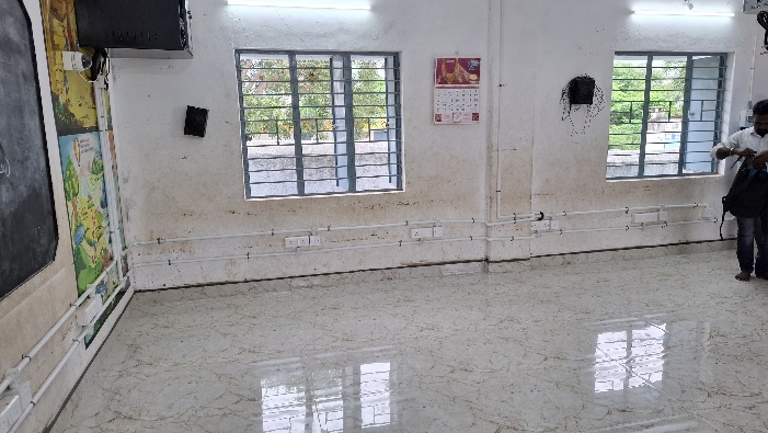 Previously, the room had only a basic cement floor. To improve the environment, we laid vitrified tiles for a cleaner and more durable surface. We also installed four ceiling fans and four tube lights to ensure proper ventilation and lighting. Additionally, we carried out electrical upgrades, including fixing the piping, replacing old wiring, and installing a new junction box to support safe and efficient power distribution. These improvements have significantly enhanced the usability of the lab for both students and teachers.