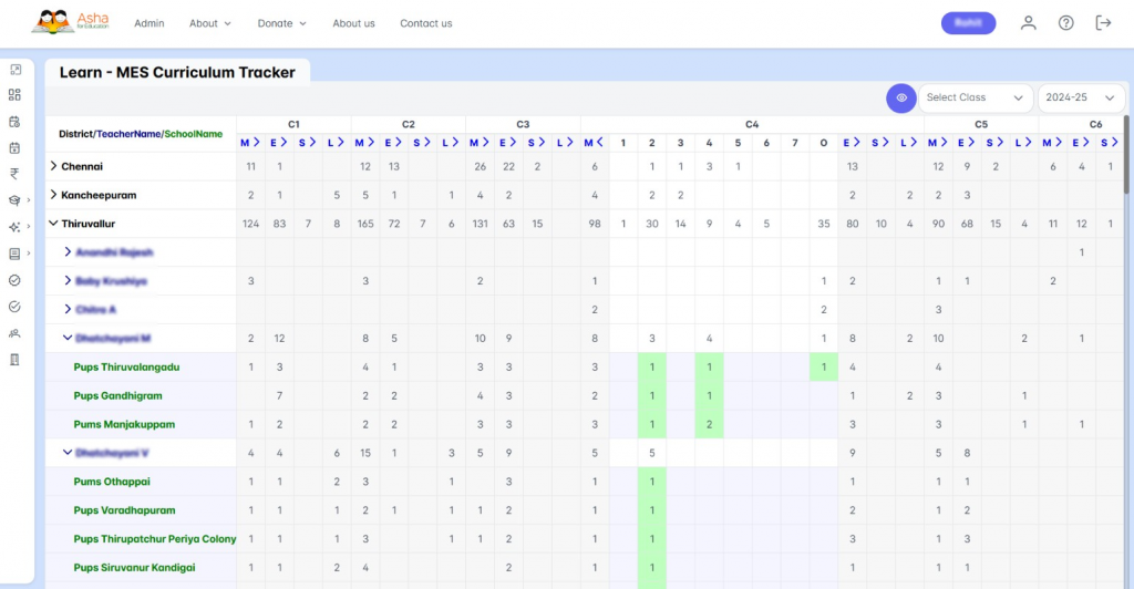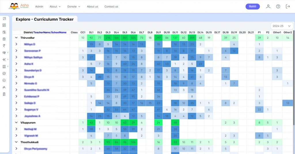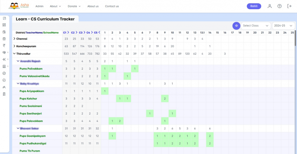 Each green square represents a lesson taught at the school. The reason some of the lessons (eg. L10 to L15) are white for most schools is that we dropped some of the lessons given the paucity of time. Dark green squares represent visits on that day by Asha trainers. The number in the square indicates that the same lesson was repeated multiple times either because the group was broken into two and separate classes taken or the lesson had to be repeated. If the lesson was taught in the wrong order (not in the pictures here), then that will be shows with a small red ‘x’ inside. Clicking on the lesson numbers at the top will open the lesson plan for that lesson and hovering will show the lesson title. Clicking on the green squares will provide the data entries (both trainer data and teacher data) corresponding to that school-class-lesson combination. The curriculum tracker provides a powerful tool to quickly get the status of the curriculum implementation at the schools and figure out any challenges at a school or with the curriculum.
